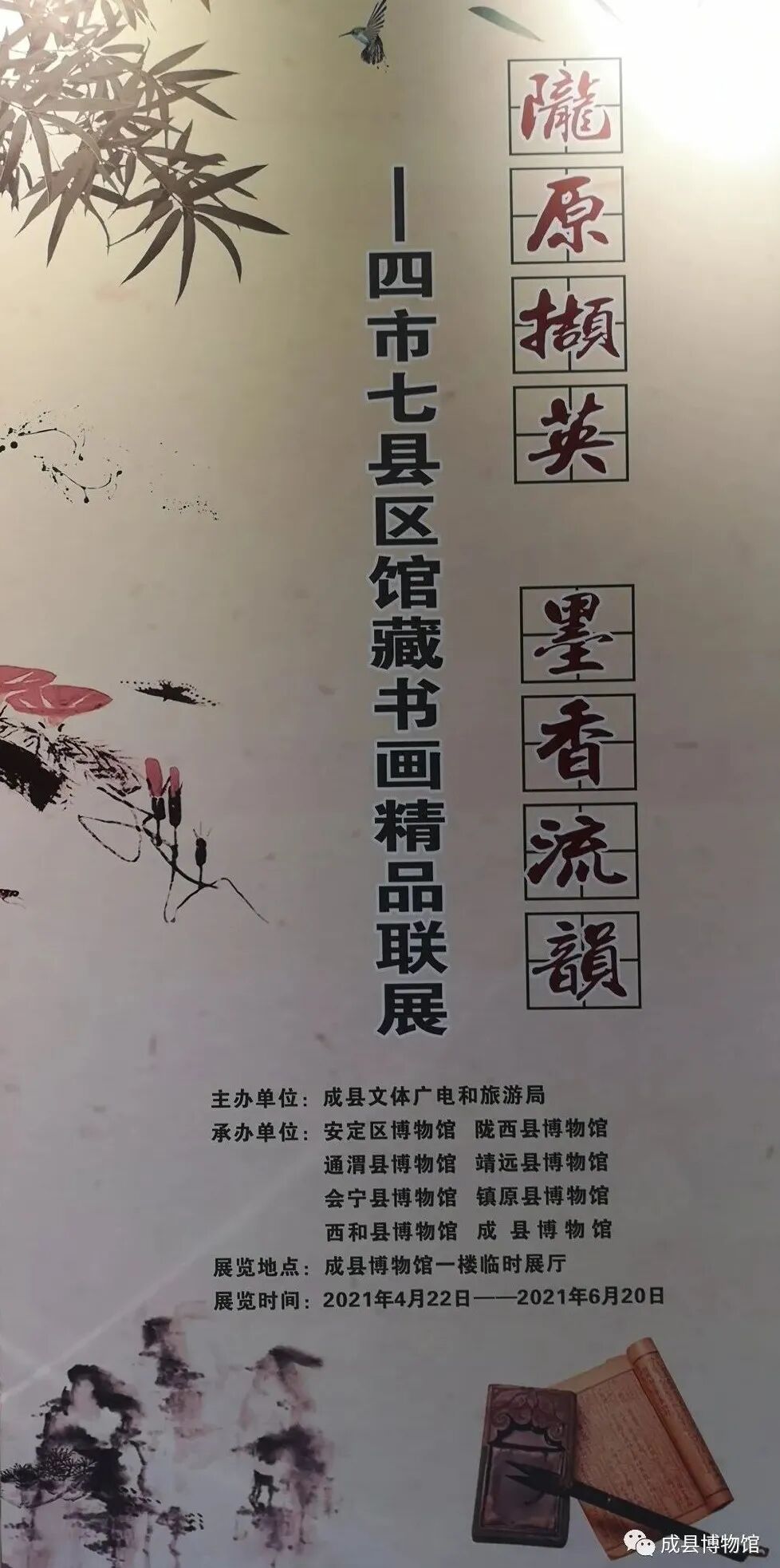 正值四月好风光,花开时节又逢君!为丰富广大群众的精神文化生活,促进馆际交流,进一步让馆藏文物活起来,由成县文体广旅局主办,定西市安定区博物馆、陇西县博物馆、通渭县博物馆,白银市靖远县博物馆、会宁县博物馆,庆阳市镇原县博物馆,陇南市西和县博物馆联合举办的"陇原撷英 墨香流韵——四市七县区馆藏书画精品联展"开幕式于4月22日在成县博物馆隆重举行。