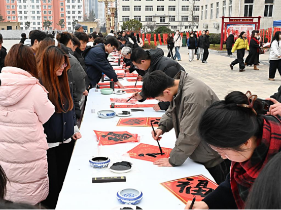 活动现场红纸铺展、墨香萦绕,洋溢着浓厚的节日气息。美术与设计学院师生和离退休党支部教职工挥毫泼墨,以笔寄意、以字传情,一幅幅寓意吉祥的春联和一个个饱满有力的“福”字在笔下流淌而出,既展现了书法艺术的魅力,也承载着对全校教职工的美好祝愿。师生们一边欣赏书法创作,一边挑选心仪的春联,现场气氛热烈而温馨。
